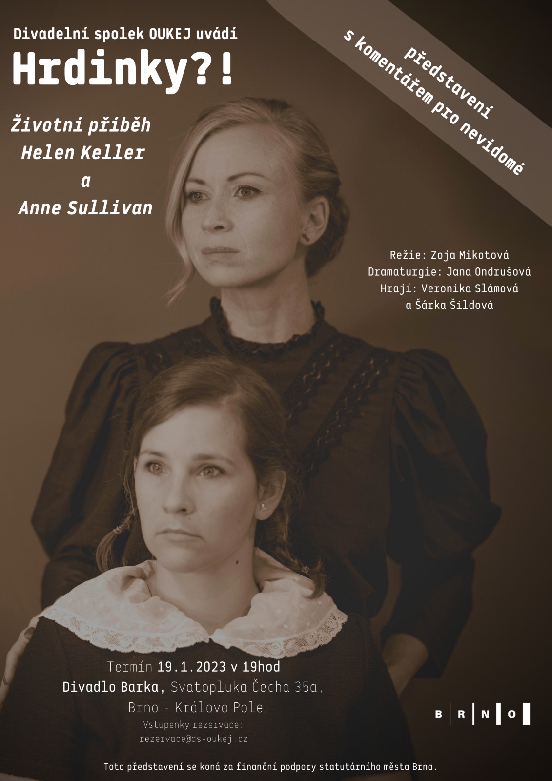 Na druhou reprízu představení Hrdinky?! v letošním roce se můžete přijít podívat v Brně 19. 1. 2024 od 19 hodin. Budeme hrát v Divadle Barka v městské části Královo Pole.