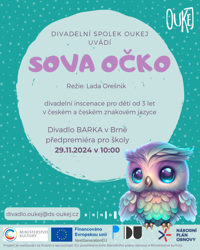 Příběh o malé sově, která se rozhodla, že už nebude obyčejným nočním ptákem, ale denní sovou vám zahrají herečky Divadelního spolku OUKEJ ve spolupráci se studenty Ateliéru divadlo a výchova pro Neslyšící na Divadelní fakultě JAMU.