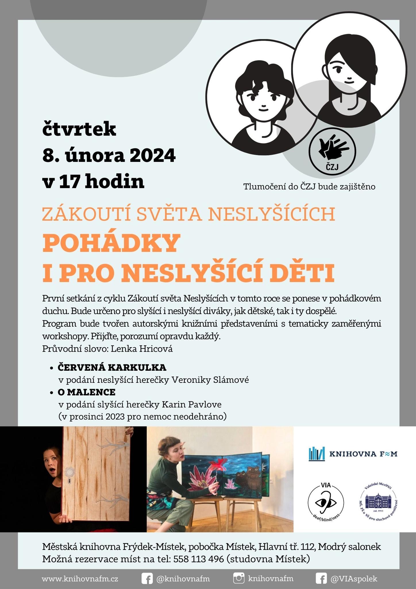 Další zajímavou akcí, o které bychom vás rádi informovali je první setkání z cyklu Zákoutí světa Neslyšících, kde bude mimo jiné vystupovat také naše herečka Veronika Slámová se svým knižním představením Červená karkulka. Akce se bude konat ve Frýdku-Místku v městské knihovně.