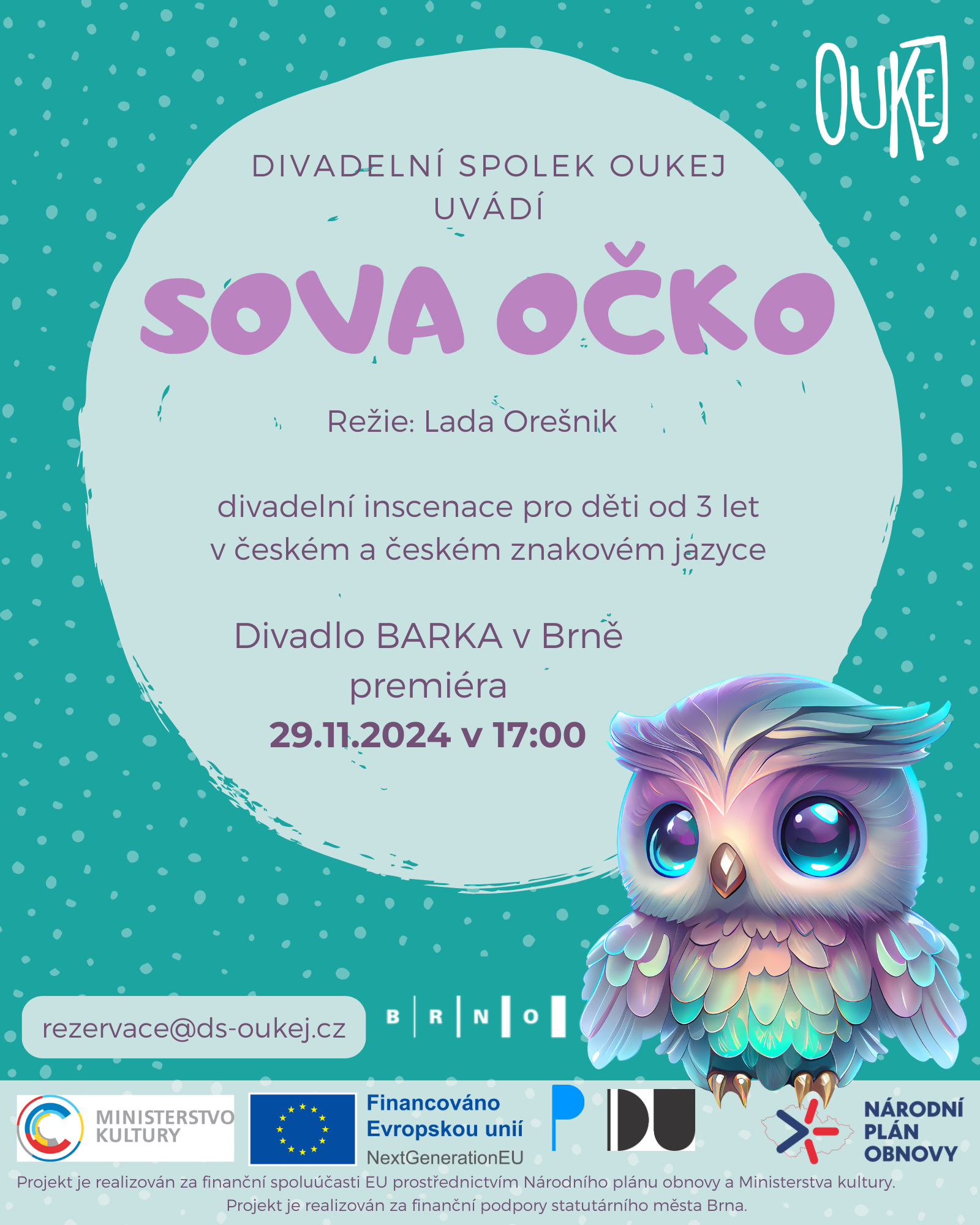 Divadelní spolek OUKEJ uvádí láskyplný, poetický příběh o malé sově, která se rozhodla, že už nebude obyčejným nočním ptákem, ale denní sovou. Inscenaci na motivy příběhu slovinské spisovatelky zpracovala neslyšící režisérka Lada Orešnik – jedna z prvních absolventek Ateliéru divadlo a výchova pro Neslyšící na Divadelní fakultě JAMU. Hrají herečky Divadelního spolku OUKEJ ve spolupráci se studentkami Ateliéru divadlo a výchova pro Neslyšící. Příběh je vyprávěn v mluvené češtině a v českém znakovém jazyce.